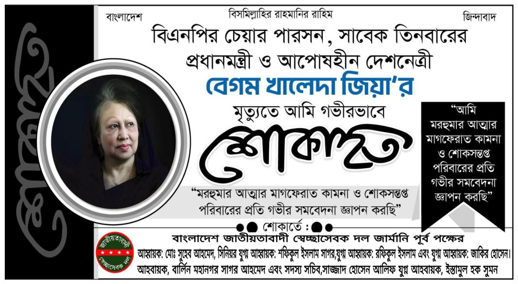 দেশনেত্রী বেগম খালেদা জিয়ার প্রয়াণে স্বেচ্ছাসেবক দল জার্মানি (পূর্ব) শাখার গভীর শোক প্রকাশ